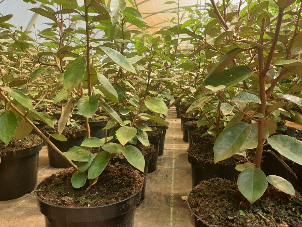 Die Belaubung ist oval, ledrig und zweifarbig: oben sattgrün, unten silbrig glänzend mit einem schönen Kontrast im Sonnenlicht. Der Wuchs ist aufrecht und breitbuschig.